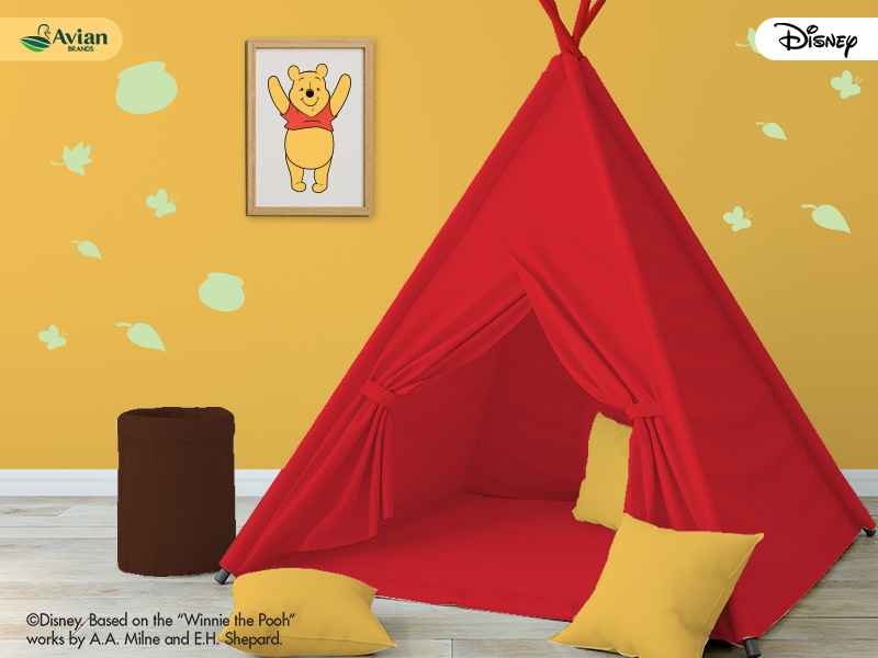 Untuk menghadirkan karakter Winnie the Pooh pada kamar anak, Sahabat Avian Brands bisa mengaplikasikan warna – warna cerah dengan menambahkan desain berbentuk lebah warna kuning dan hitam serta karakter Winnie the Pooh itu sendiri.