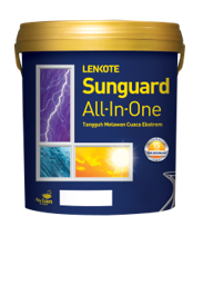 Dengan berbahan dasar 100% superior akrilik sehingga Cat Tembok Eksterior Sunguard All-In-One dapat menahan panas dan membuat suhu ruangan 5˚C lebih sejuk dan warna tidak mudah pudar karena perlindungan yang luar biasa terhadap sinar UV.