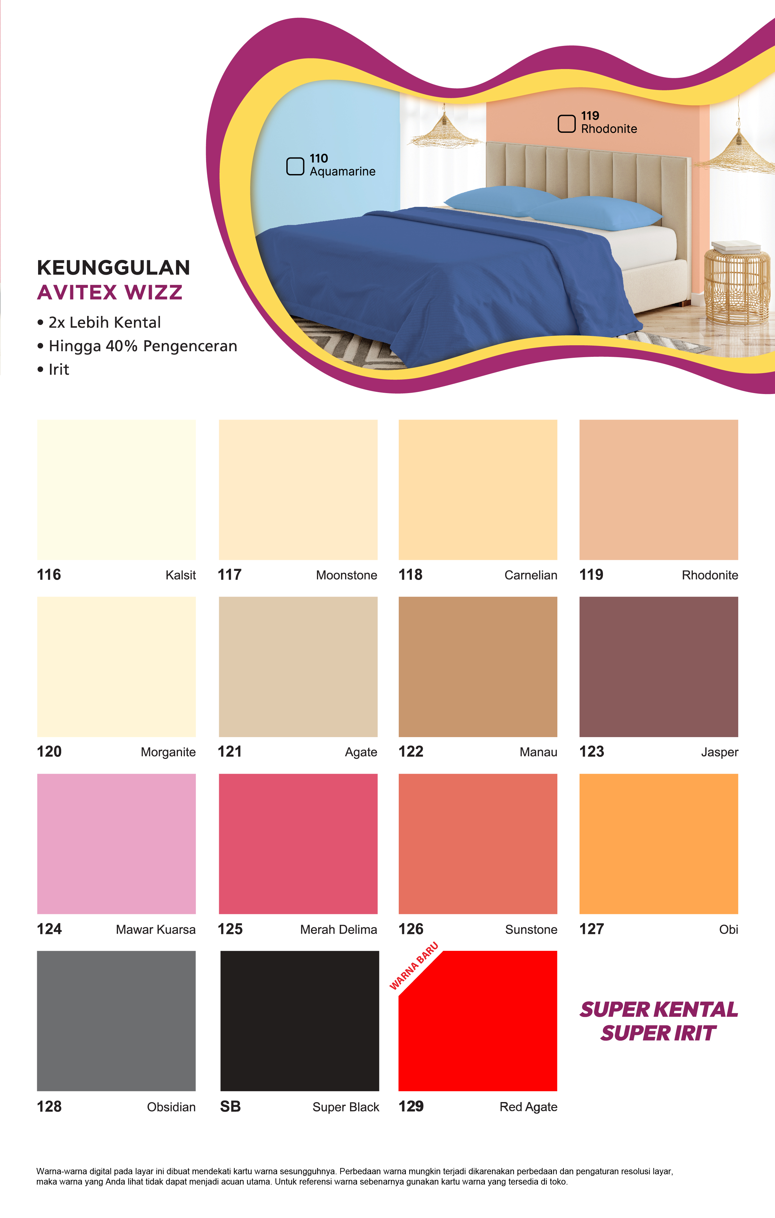 Avitex Wizz adalah cat tembok yang diformulasi khusus 2x lebih kental, dapat diencerkan hingga 40% sehingga lebih irit, cepat kering, dengan garansi hingga 3 tahun untuk memberikan daya tutup terbaik dan menutup ketidaksempurnaan pada tembok interior rumah Anda.
