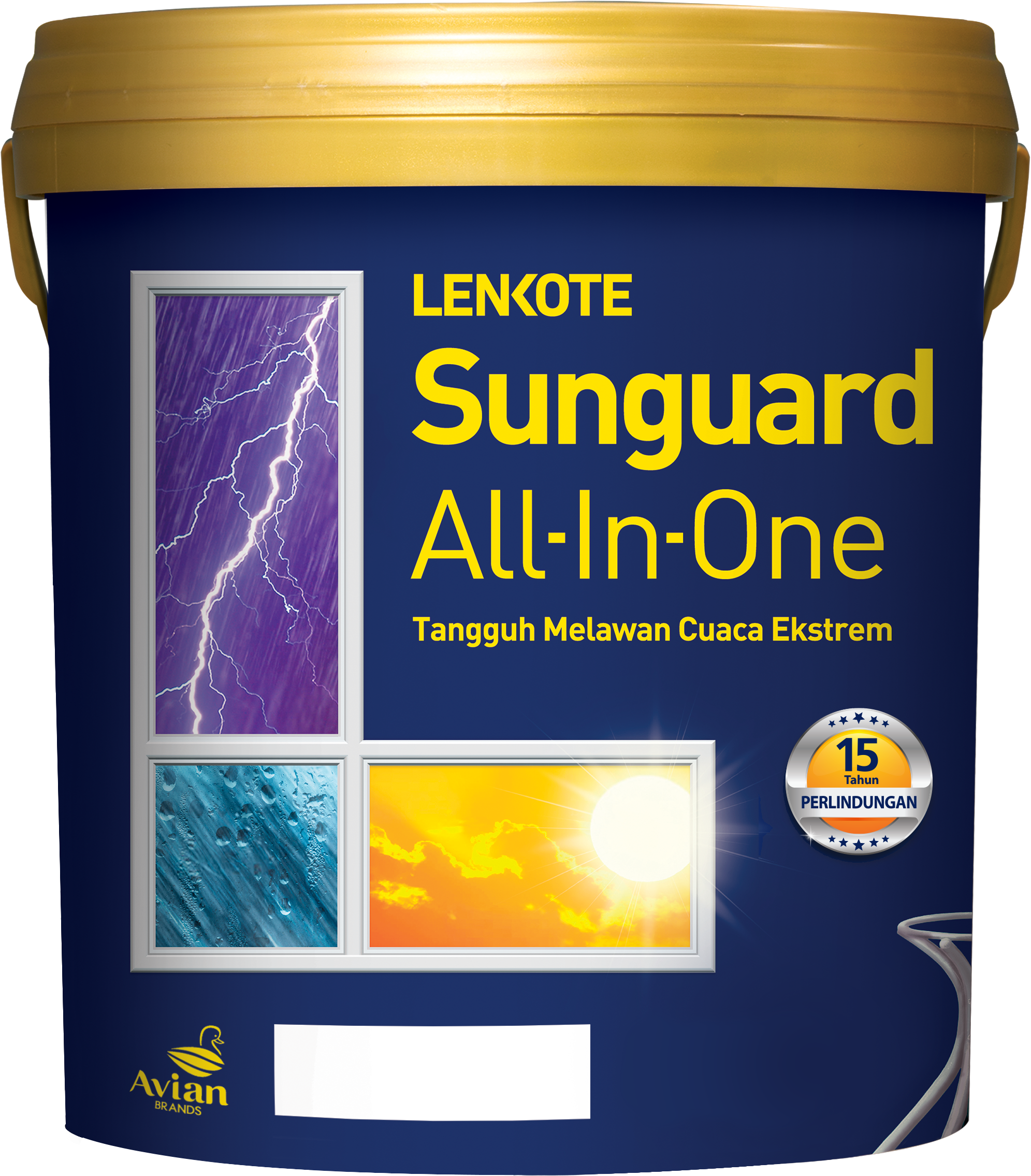 Sunguard All-In-One adalah cat eksterior bermutu tinggi yang berbahan dasar 100% superior akrilik yang diformulasi khusus tanpa timbal dan merkuri untuk perlindungan permukaan dinding luar dari cuaca ekstrem di Indonesia hingga 15 tahun. Formula khusus dari Sunguard All-In-One dapat menahan panas sehingga suhu ruangan 5℃ lebih sejuk dan warna tidak mudah pudar karena perlindungan yang luar biasa terhadap sinar UV. Sunguard All-In-One memiliki lapisan elastis yang dapat menutup retak rambut dengan sempurna dan kotoran tidak mudah menempel karena memiliki teknologi self-cleaning sehingga dinding tetap bersih, bebas dari jamur dan lumut.